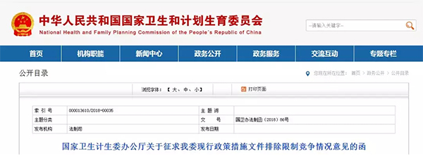 不久前,國家衛(wèi)計委發(fā)布《國家衛(wèi)生計生委辦公廳關(guān)于征求我委現(xiàn)行政策措施文件排除限制競爭情況意見的函》(以下簡稱《函》)。
