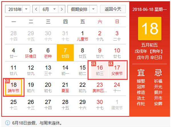 2018年北京華康普美科技有限公司,“端午節(jié)”假期為:6月18日放假,與周末連休(6月16日-6月18)