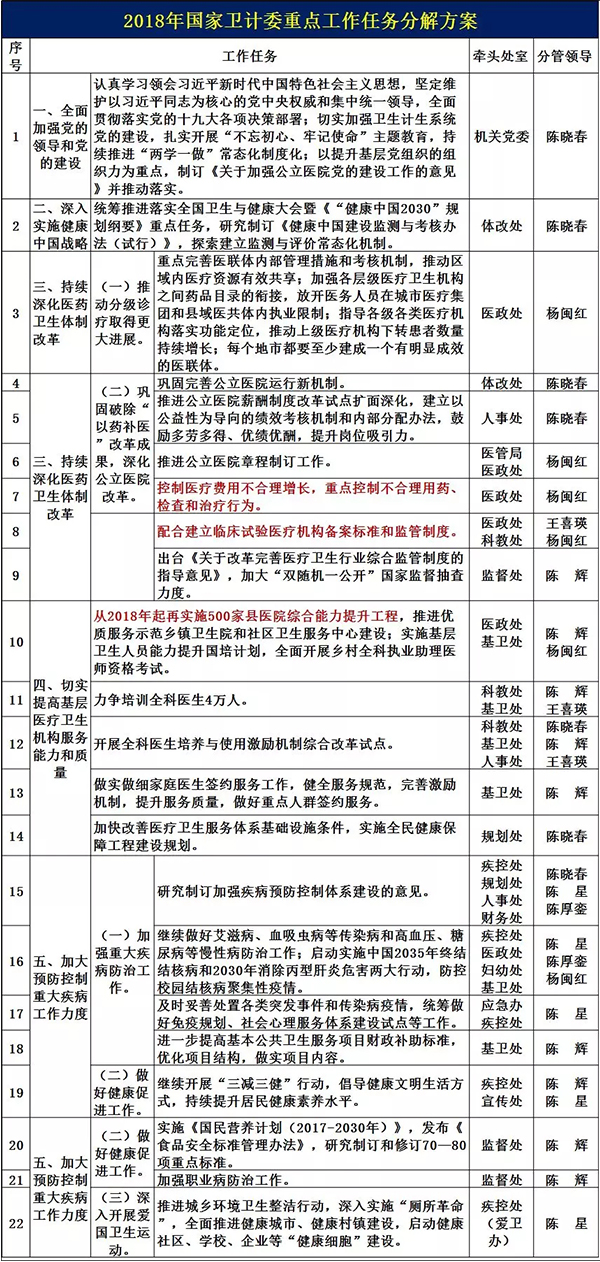 近日,國(guó)家衛(wèi)計(jì)委發(fā)布了《國(guó)家衛(wèi)生計(jì)生委關(guān)于印發(fā)2018年衛(wèi)生計(jì)生重點(diǎn)工作任務(wù)及分工方案的通知》(國(guó)衛(wèi)辦函〔2018〕25號(hào))》。(以下簡(jiǎn)稱《通知》)。