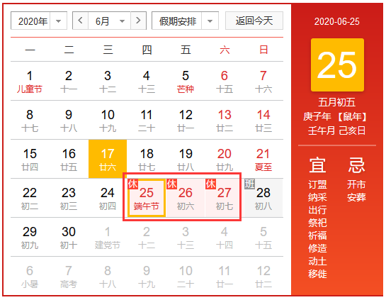 2020年北京華康普美科技有限公司,“端午節(jié)”假期為:6月25日-6月27日放假調休,6月28日(周日)上班。