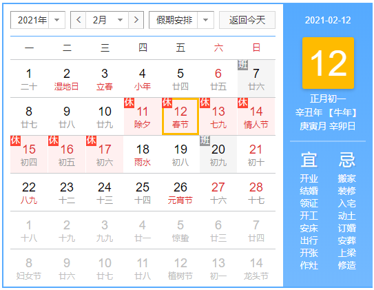 根據(jù)國務(wù)院辦公廳通知,2021年春節(jié)放假安排如下:2月11日(星期四、農(nóng)歷除夕)至2月17日(星期三)放假調(diào)休,共7天。2月7日(星期日)、2月20日(星期六)上班。