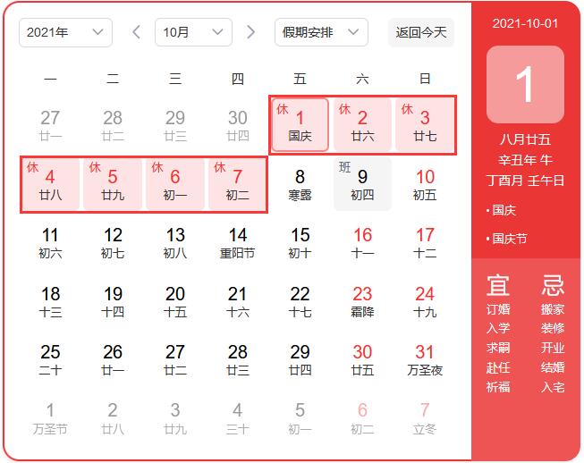 根據(jù)《國務(wù)院辦公廳關(guān)于2021年部分節(jié)假日安排的通知》,現(xiàn)將公司2021年國慶節(jié)放假的相關(guān)事宜通知如下:2021年北京華康普美科技有限公司,國慶節(jié)假期為:10月1日至7日放假調(diào)休,共7天。9月26日(星期日)、10月9日(星期六)上班。