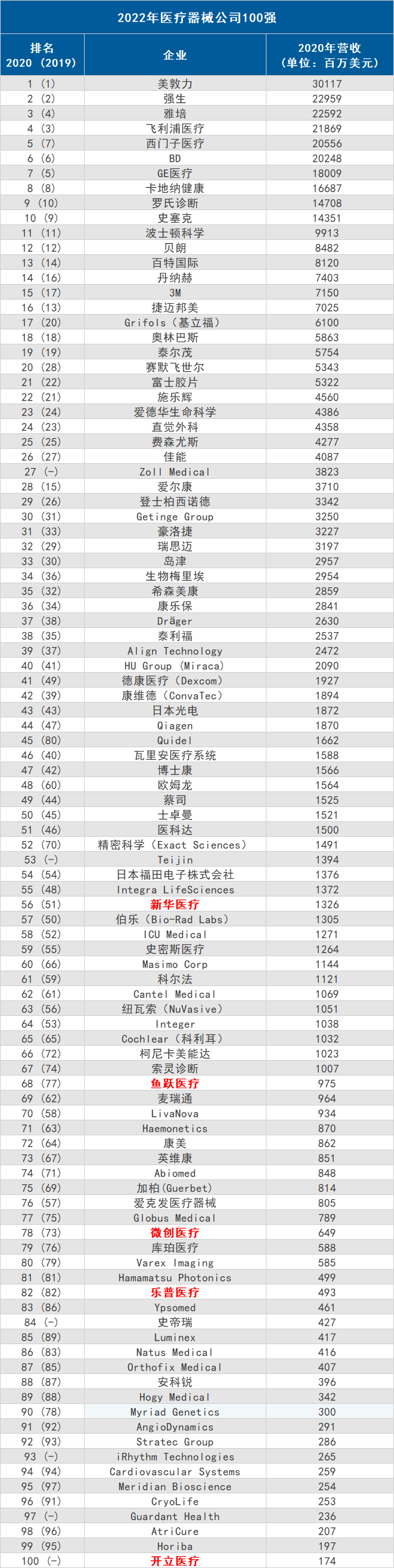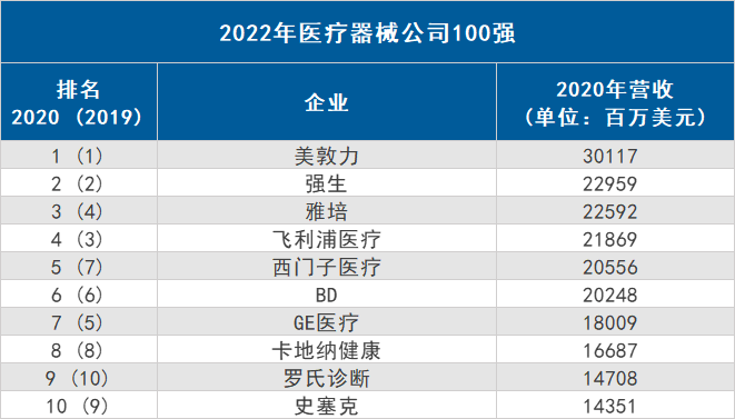 近日,國外權(quán)威的第三方網(wǎng)站QMED最新發(fā)布了《2022年醫(yī)療器械企業(yè)百強榜單》,該榜單根據(jù)2020財年的營收狀況對全球醫(yī)療器械公司進行了排名。