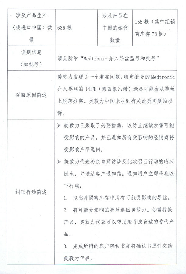 根據(jù)2013年12月2日上海市食品藥品監(jiān)督管理局的報(bào)告,由于PTFE(聚四氟乙烯)涂層可能會(huì)從導(dǎo)絲上脫落分離等原因,Medtronic,Inc.公司對其生產(chǎn)的導(dǎo)引導(dǎo)絲(注冊號:國食藥監(jiān)械(進(jìn))字2013第3771007號)、導(dǎo)絲(注冊號:國食藥監(jiān)械(進(jìn))字2010第3771926號)進(jìn)行主動(dòng)召回。請各省、自治區(qū)、直轄市食品藥品監(jiān)督管理局加強(qiáng)對此類產(chǎn)品的監(jiān)督管理。