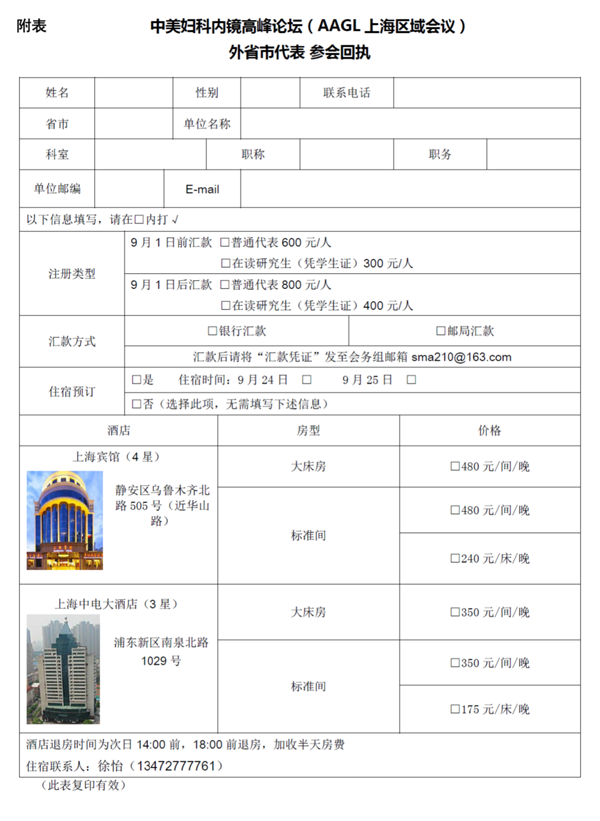 需要代為預(yù)訂住宿的代表請?zhí)顚?ldquo;參會回執(zhí)”(見附表),或登錄訂房網(wǎng)站http://www.opttrip.com/meeting/default.aspx
