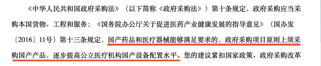 《中華人民共和國(guó)政府采購(gòu)法》(以下簡(jiǎn)稱《政府采購(gòu)法》)第十條規(guī)定,政府采購(gòu)應(yīng)當(dāng)采購(gòu)本國(guó)貨物、工程和服務(wù);《國(guó)務(wù)院辦公廳關(guān)于促進(jìn)醫(yī)藥產(chǎn)業(yè)健康發(fā)展的指導(dǎo)意見(jiàn)》(國(guó)辦發(fā)〔2016〕11號(hào))第十三條規(guī)定,國(guó)產(chǎn)藥品和醫(yī)療器械能夠滿足要求的,政府采購(gòu)項(xiàng)目原則上須采購(gòu)國(guó)產(chǎn)產(chǎn)品,逐步提高公立醫(yī)療機(jī)構(gòu)國(guó)產(chǎn)設(shè)備配置水平。