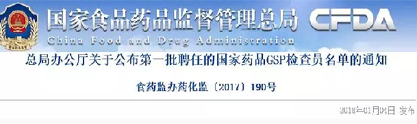 1月4日,國(guó)家食藥監(jiān)總局發(fā)布《關(guān)于公布第一批聘任的國(guó)家藥品GSP檢查員名單的通知》。