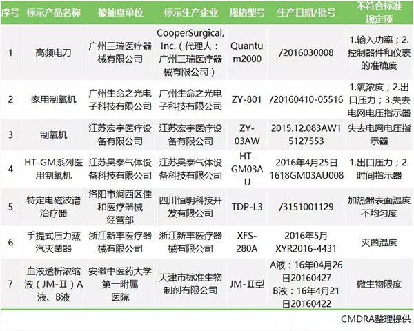 被抽檢項(xiàng)目不符合標(biāo)準(zhǔn)規(guī)定的醫(yī)療器械產(chǎn)品:涉及7家企業(yè)的5個品種7批(臺)。