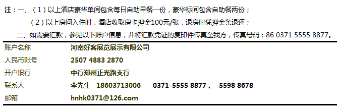 4、 提供會務(wù)公司發(fā)票(開票項目:會務(wù)費)和酒店發(fā)票(開票項目:住宿費),如有需開增值稅專票,請將開票信息傳真到 0371-55558877 或者以電子郵件形式發(fā)送到訂房郵箱中。
