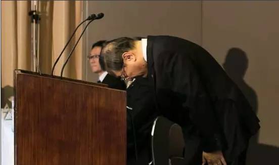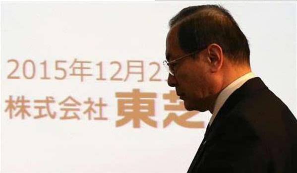 (圖為東芝公司社長室町正志在發(fā)布會上鞠躬)