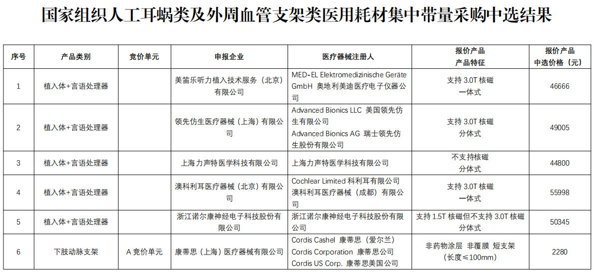 本次集采人工耳蝸類耗材需求量共1.1萬套,5家企業(yè)中選,包括奧地利美迪醫(yī)療、美國領(lǐng)先仿生、澳大利亞科利耳等外資企業(yè),以及上海力聲特、浙江諾爾康等內(nèi)資企業(yè)。