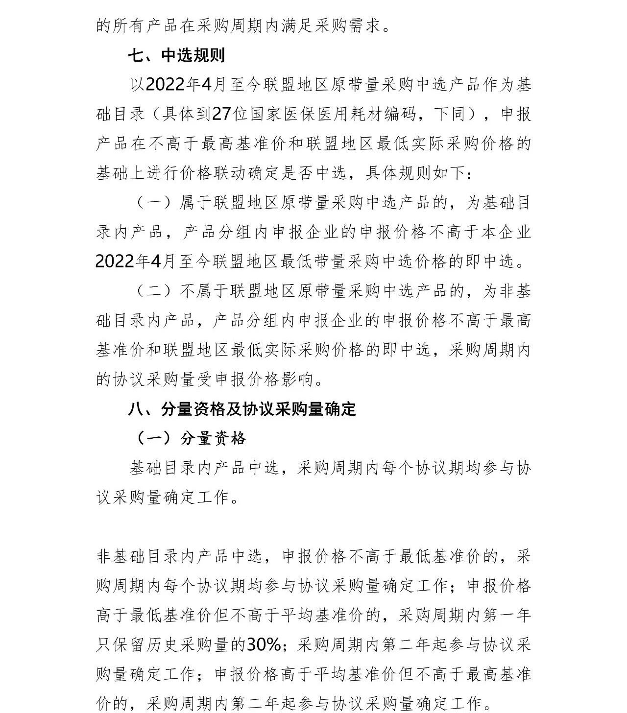 以2022年4月至今聯(lián)盟地區(qū)原帶量采購中選產(chǎn)品作為基礎目錄(具體到27位國家醫(yī)保醫(yī)用耗材編碼,申報產(chǎn)品在不高于最高基準價和聯(lián)盟地區(qū)最低實際采購價格的基礎上進行價格聯(lián)動確定是否中選,具體規(guī)則如下: