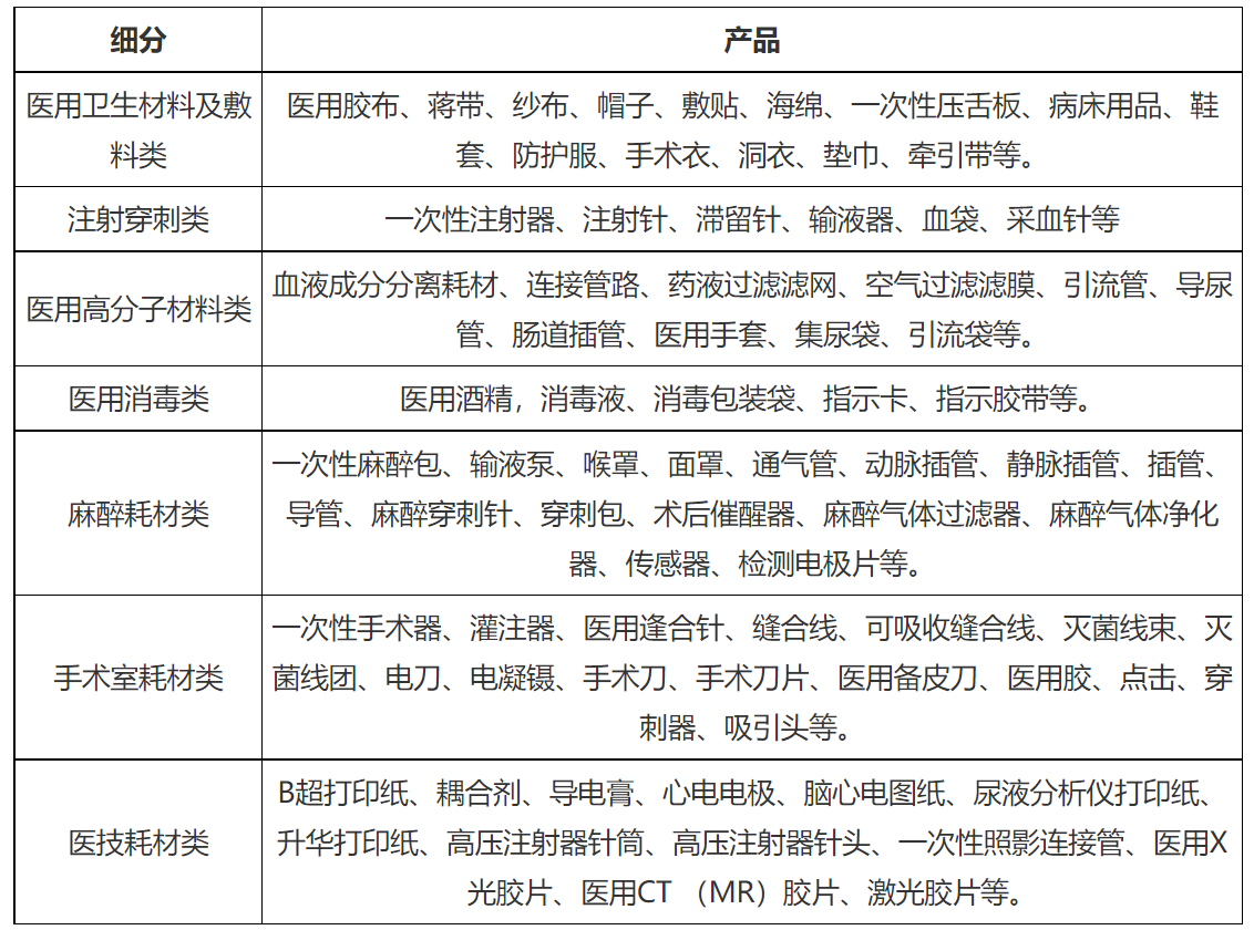 低值醫(yī)用耗材主要是指醫(yī)療服務(wù)過(guò)程中經(jīng)常使用的一次性衛(wèi)生材料,可分為醫(yī)用衛(wèi)生材料及敷料類(lèi)、注射穿刺類(lèi)、醫(yī)用高分子材料類(lèi)、醫(yī)用消毒類(lèi)、麻醉耗材類(lèi)、手術(shù)室耗材類(lèi)和醫(yī)技耗材類(lèi)。