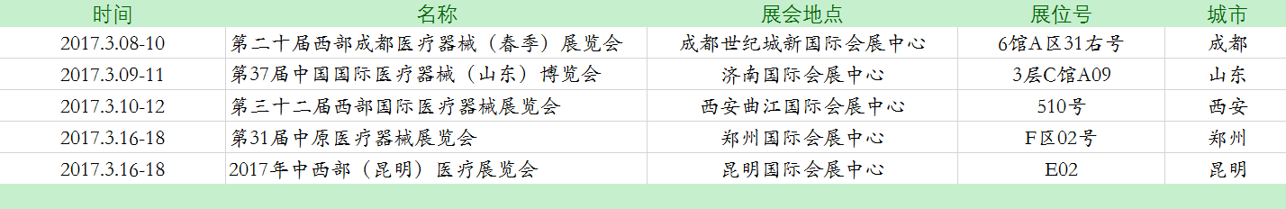 日前,為期半個月的五個展會相繼圓滿結(jié)束 !! 分別是“第二十屆西部成都醫(yī)療器械(春季)展覽會”、“第37屆中國國際醫(yī)療器械(山東)博覽會”、“第三十二屆西部國際醫(yī)療器械展覽會”、“第31屆中原醫(yī)療器械展覽會”、以及“2017年中西部(昆明)醫(yī)療展覽會” 。詳細(xì)時間地點見下表