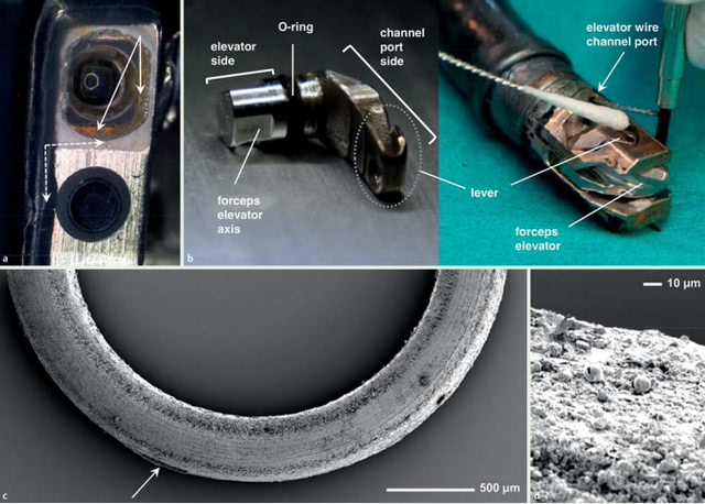 一組感染內(nèi)鏡部分拆卸零件的電子顯微照片顯示,內(nèi)鏡鏡蓋靠近物鏡部分有裂痕,幾個(gè)內(nèi)鏡部件表面可見棕色染色的污垢