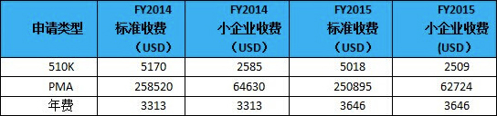 如2015財政年的510(k)申請,標準收費為USD5018,小企業(yè)收費為USD2509;2015財政年的PMA申請,標準收費為USD250,895,小企業(yè)收費為USD62,724??梢钥闯觯行∑髽I(yè)資質(zhì)的企業(yè)所需繳納的費用確實比普通企業(yè)減少許多。不過,對于年費,普通企業(yè)與小企業(yè)需繳納的金額是一樣的。對比2014財政年(FY2014)的收費,見下表: