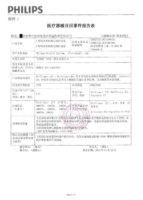 飛利浦(中國)投資有限公司報告,涉及產(chǎn)品某些緊固件無法被確認(rèn)是否根據(jù)規(guī)范要求進行了扭轉(zhuǎn),如果未按規(guī)定扭轉(zhuǎn)緊固件,則系統(tǒng)運行時會發(fā)生故障,緊固件固定的部件可能會松動,從而造成潛在危害。飛利浦(中國)投資有限公司對X射線計算機斷層攝影設(shè)備(注冊證號:國械注進20153300422、國食藥監(jiān)械(進)字2012第3303860)、X射線計算機體層攝影設(shè)備(注冊證號:國械注進20163301984、)主動召回。召回級別為三級。涉及產(chǎn)品的型號、規(guī)格及批次等詳細信息見《醫(yī)療器械召回事件報告表》。