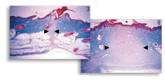 傷口愈合改進(jìn) 觀察豬皮皮膚切口的縮影(圖3 )與標(biāo)準(zhǔn)的尖端切口(圖4 ),經(jīng)由梅森氏三色染色顯示纖維增生明顯減少,如膠原沉積的程度和炎癥反應(yīng)。