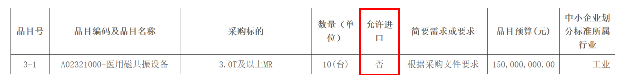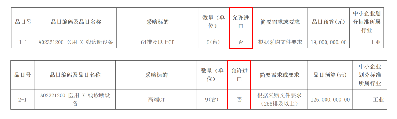 項(xiàng)目分3個(gè)包,采購標(biāo)的分別為64排及以上CT、高端CT、3.0T及以上MR,對(duì)應(yīng)預(yù)算金額分別為1900萬元、1.26億元、1.50億元。值得關(guān)注的是,包含256排及以上高端CT在內(nèi)的各類設(shè)備采購中,“允許進(jìn)口”一欄均標(biāo)注為「否」。