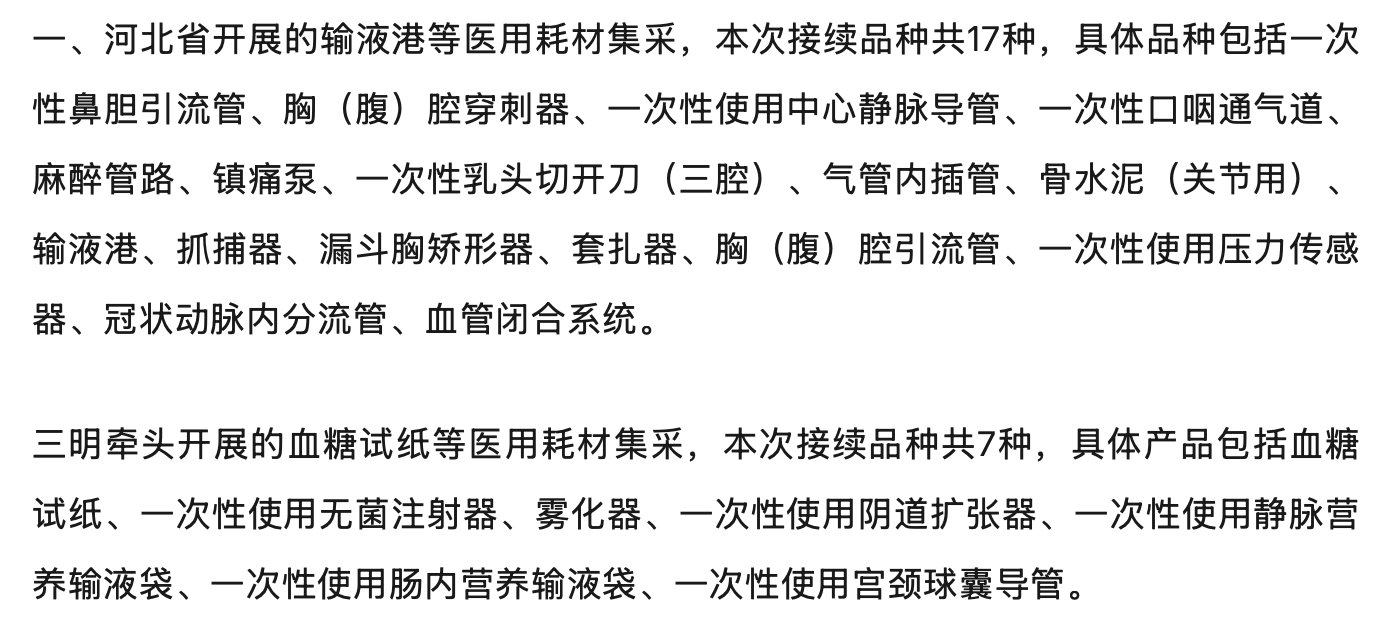 2月8日,河北省醫(yī)保局發(fā)布《關(guān)于發(fā)布河北省、部分聯(lián)盟醫(yī)用耗材集中帶量采購(gòu)到期接續(xù)采購(gòu)文件的通知》(附文末)。