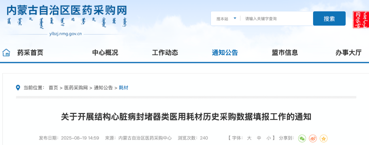 兩份通知都明確提到,此次歷史采購數(shù)據(jù)填報工作是根據(jù)福建省牽頭省際聯(lián)盟結(jié)構(gòu)心臟病封堵器類醫(yī)用耗材省際聯(lián)盟集中帶量采購工作安排,其中內(nèi)蒙古于8月31日截止,四川于9月1日截止。