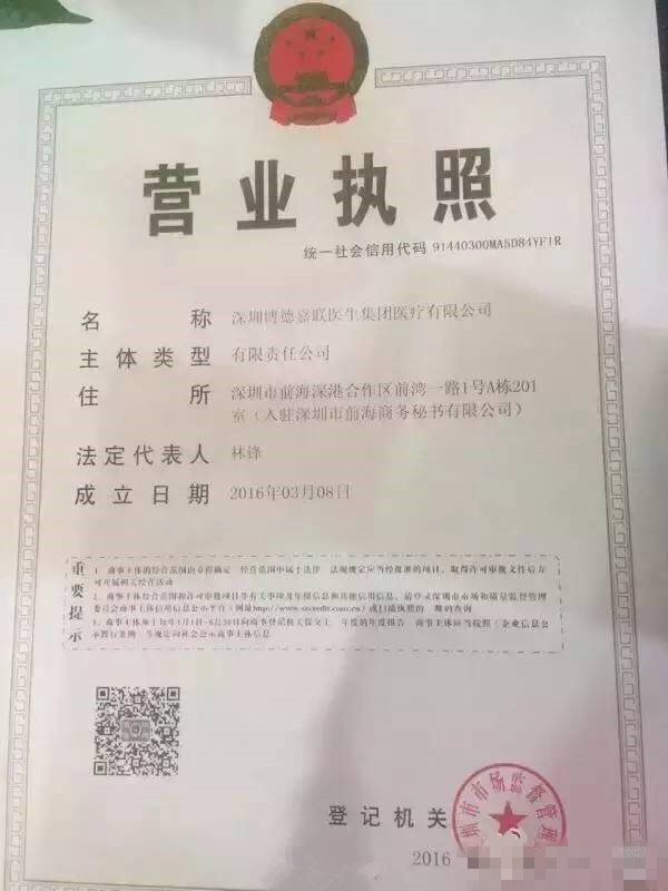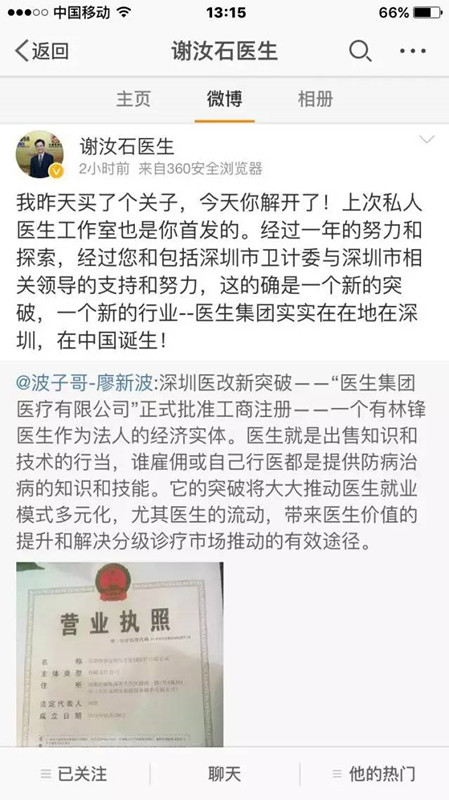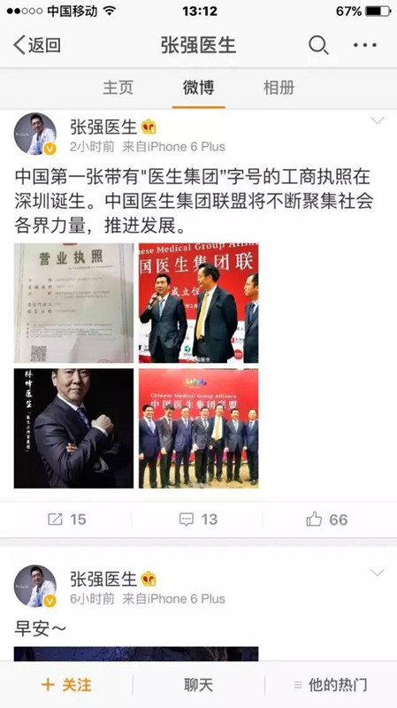 今天張強(qiáng)又發(fā)微博稱:“中國第一張帶有“醫(yī)生集團(tuán)”字號的工商執(zhí)照在深圳誕生。中國醫(yī)生集團(tuán)聯(lián)盟將不斷聚集社會各界力量,推進(jìn)發(fā)展。”