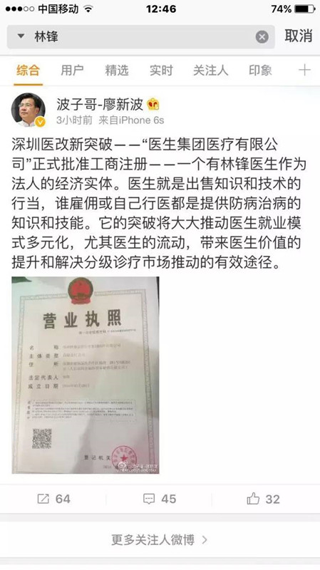 謝汝石在給廖新波的道賀微博中說:“經(jīng)過一年的努力和探索,經(jīng)過您和包括深圳市衛(wèi)計委與深圳市相關(guān)領(lǐng)導(dǎo)的支持和努力,這的確是一個新的突破,一個新的行業(yè)——醫(yī)生集團(tuán)實實在在地在深圳,在中國誕生!”