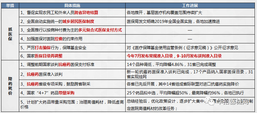 醫(yī)療保障局上線后,備受關(guān)注。梳理其上線后的工作,雖一手抓醫(yī)保、一手降藥(耗)價,開展了多項令人矚目的工作(具體工作及進展見下圖)。但或許是精力有限,又或許是醫(yī)用耗材在整個醫(yī)藥領(lǐng)域占比小等原因,尚未真正影響醫(yī)用耗材領(lǐng)域。