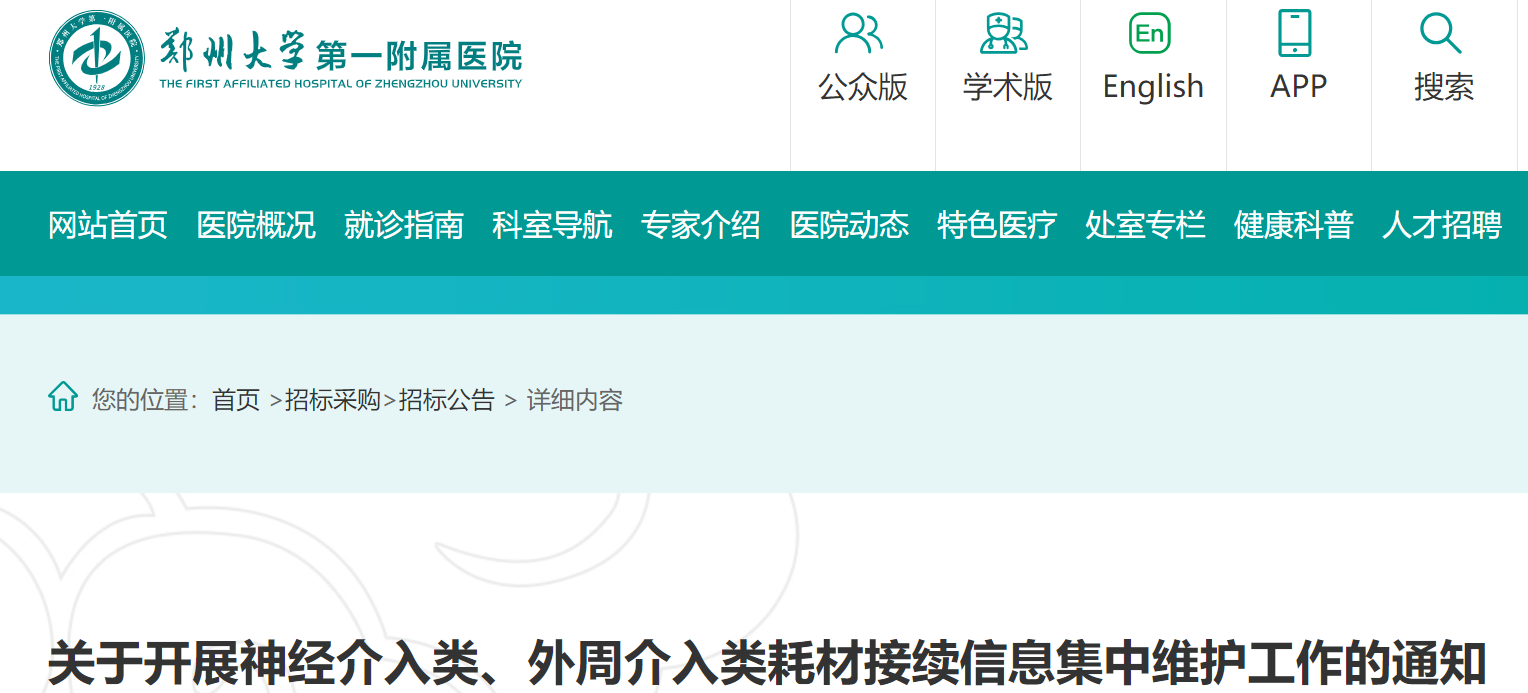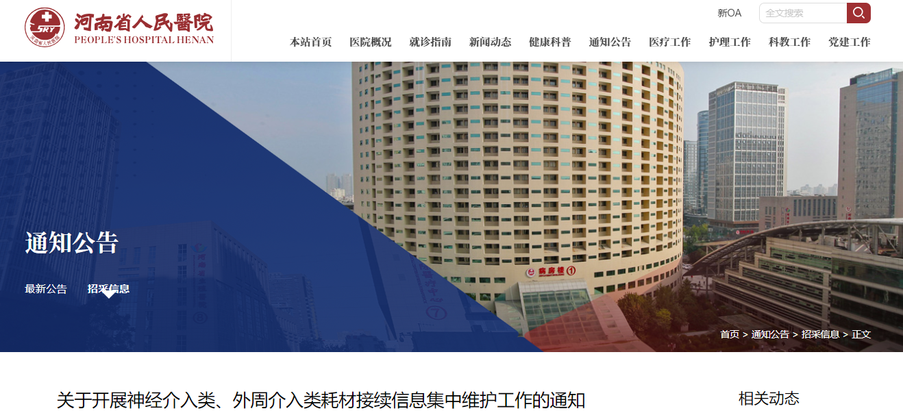 近日,鄭州大學(xué)第一附屬醫(yī)院、河南省人民醫(yī)院接連發(fā)布《關(guān)于開展神經(jīng)介入類、外周介入類耗材接續(xù)信息集中維護(hù)工作的通知》(簡(jiǎn)稱《通知》)。