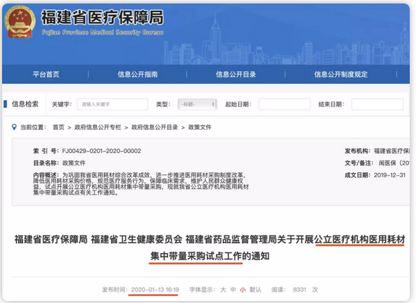 1月13日,福建省醫(yī)保局、省衛(wèi)生健康委員會、省藥監(jiān)局發(fā)布《關(guān)于開展公立醫(yī)療機(jī)構(gòu)醫(yī)用耗材集中帶量采購試點(diǎn)工作的通知》。