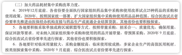 2020年,按照國家統(tǒng)一部署,擴(kuò)大國家組織集中采購和使用藥品品種范圍。綜合醫(yī)改試點(diǎn)省份要率先推進(jìn)由醫(yī)保經(jīng)辦機(jī)構(gòu)直接與藥品生產(chǎn)或流通企業(yè)結(jié)算貨款,其他省份也要積極探索。