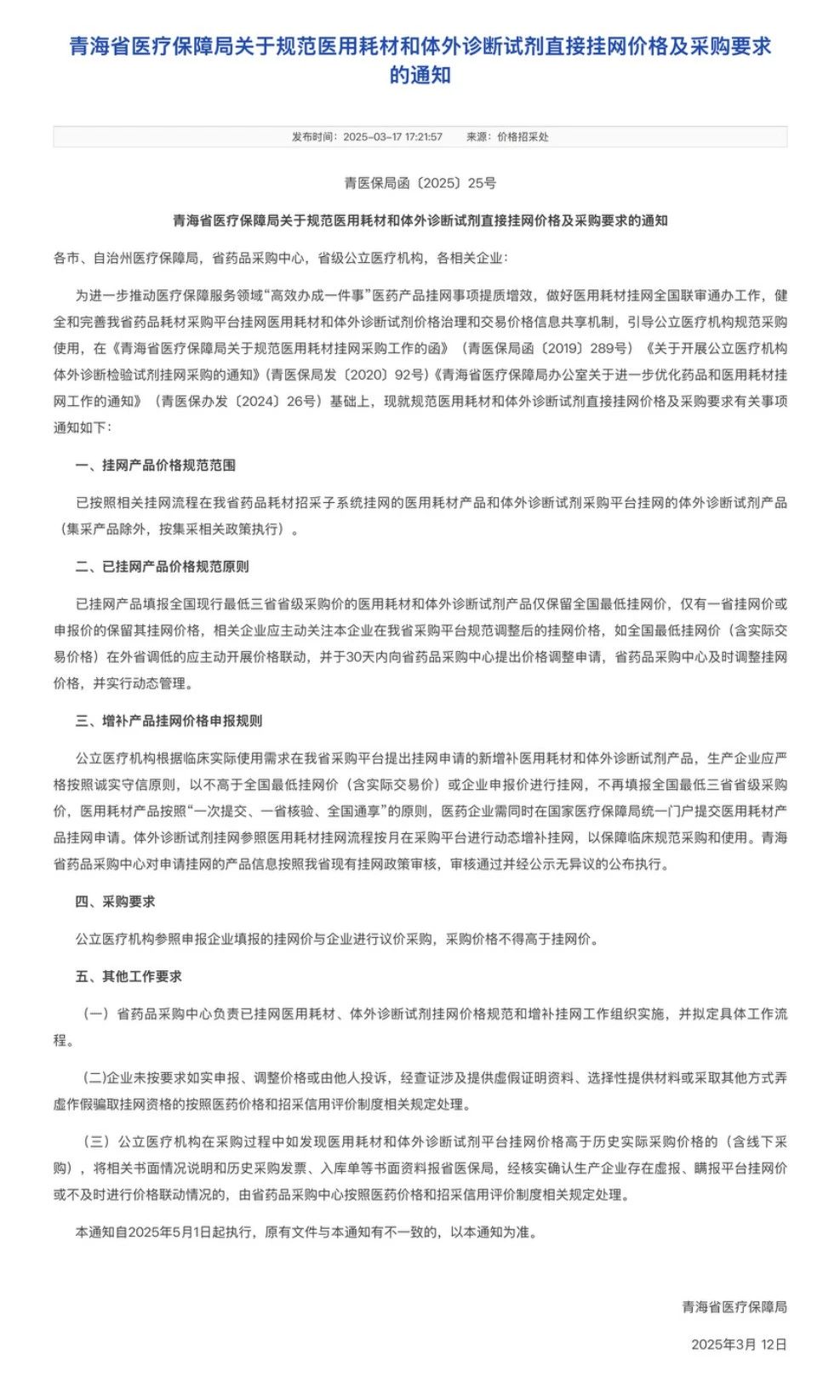 3月17日,青海省醫(yī)保局發(fā)布《關(guān)于規(guī)范醫(yī)用耗材和體外診斷試劑直接掛網(wǎng)價格及采購要求的通知》,對醫(yī)用耗材和體外診斷試劑直接掛網(wǎng)價格及采購要求進行調(diào)整。