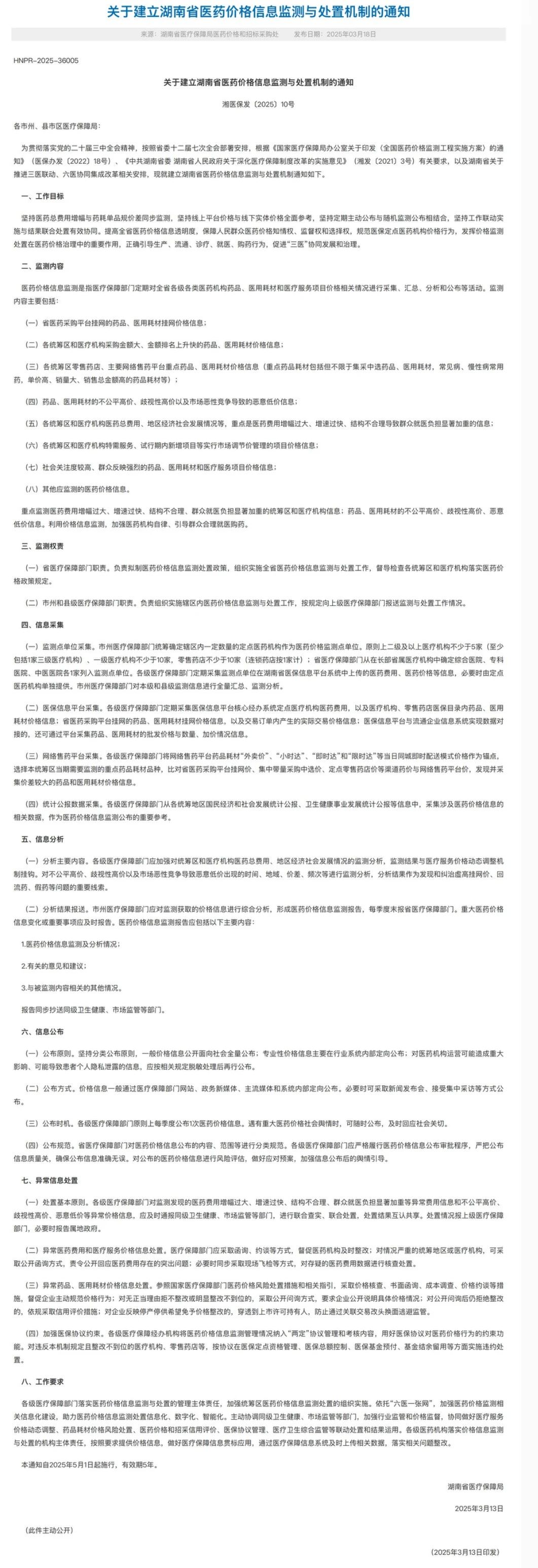 同樣在5月1日開始執(zhí)行的,還有湖南省醫(yī)保局發(fā)布的《關(guān)于建立湖南省醫(yī)藥價格信息監(jiān)測與處置機制的通知》。文件提出,重點監(jiān)測醫(yī)藥費用增幅過大、增速過快、結(jié)構(gòu)不合理、群眾就醫(yī)負擔(dān)顯著加重的統(tǒng)籌區(qū)和醫(yī)療機構(gòu)信息;藥品、醫(yī)用耗材的不公平高價、歧視性高價、惡意低價信息。利用價格信息監(jiān)測,加強醫(yī)藥機構(gòu)自律、引導(dǎo)群眾合理就醫(yī)購藥。