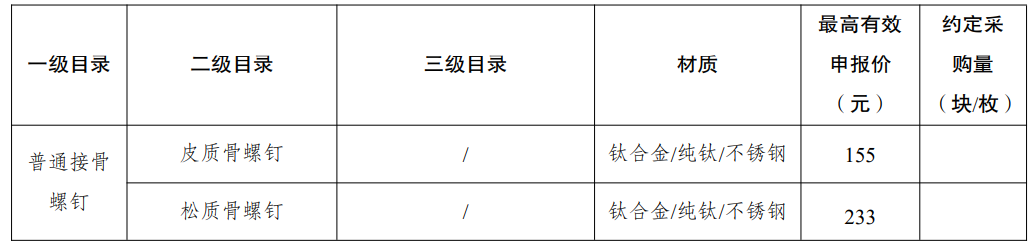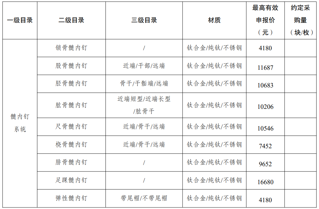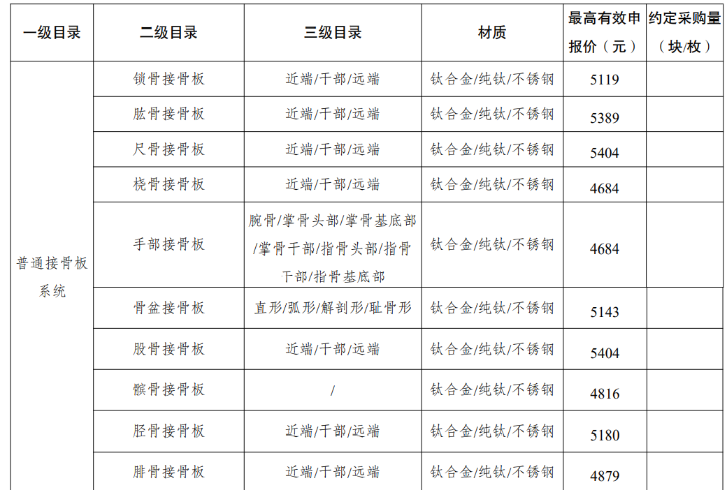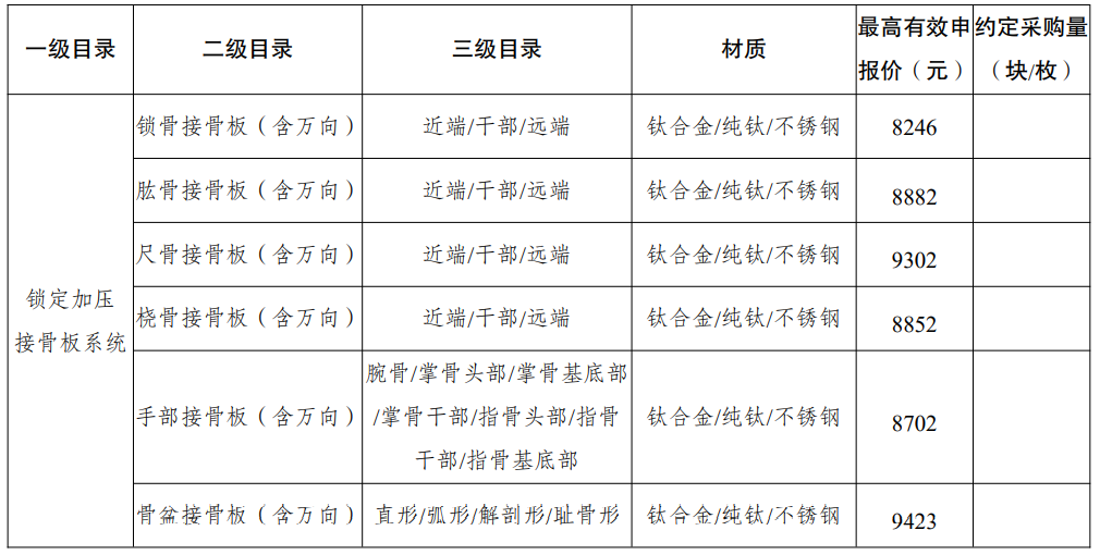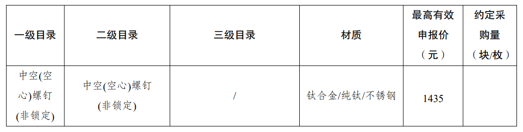 采購品種:鎖定加壓接骨板系統(tǒng)、普通接骨板系統(tǒng)、髓內(nèi)釘系統(tǒng)、單獨(dú)使用的螺釘?shù)裙强苿?chuàng)傷類產(chǎn)品,以及部分5mm集成超聲刀頭。