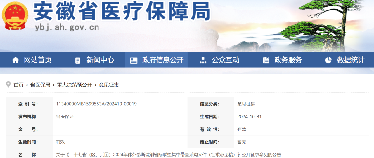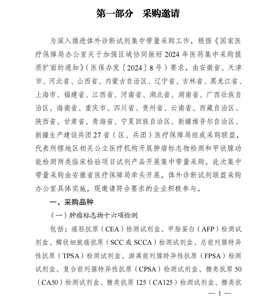 10月31日,安徽醫(yī)保局發(fā)布《二十七省(區(qū)、兵團(tuán))2024年體外診斷試劑省際聯(lián)盟集中帶量采購(gòu)文件(征求意見(jiàn)稿)》(完整見(jiàn)文末)。