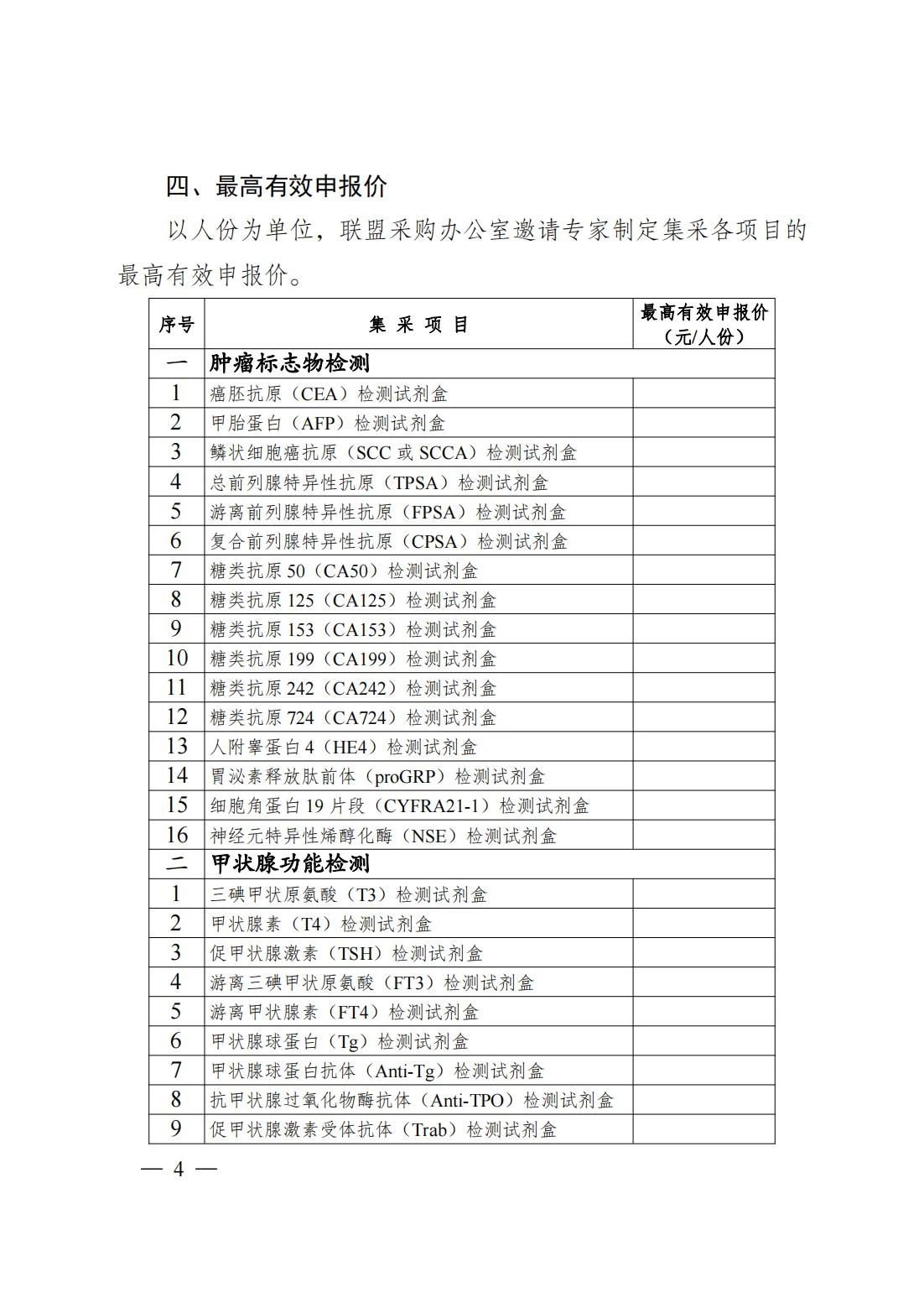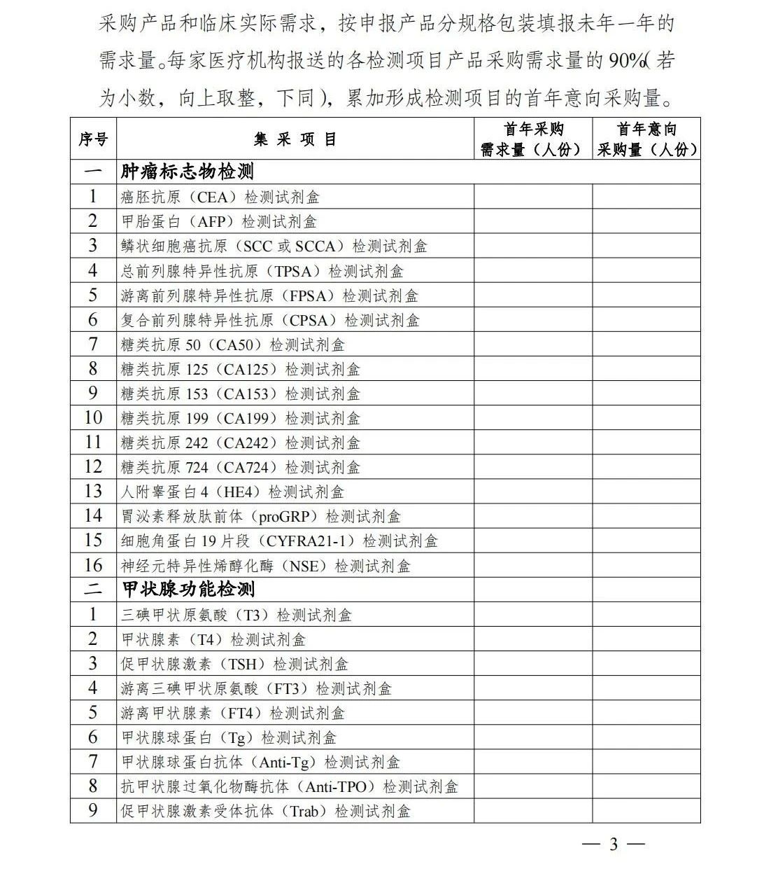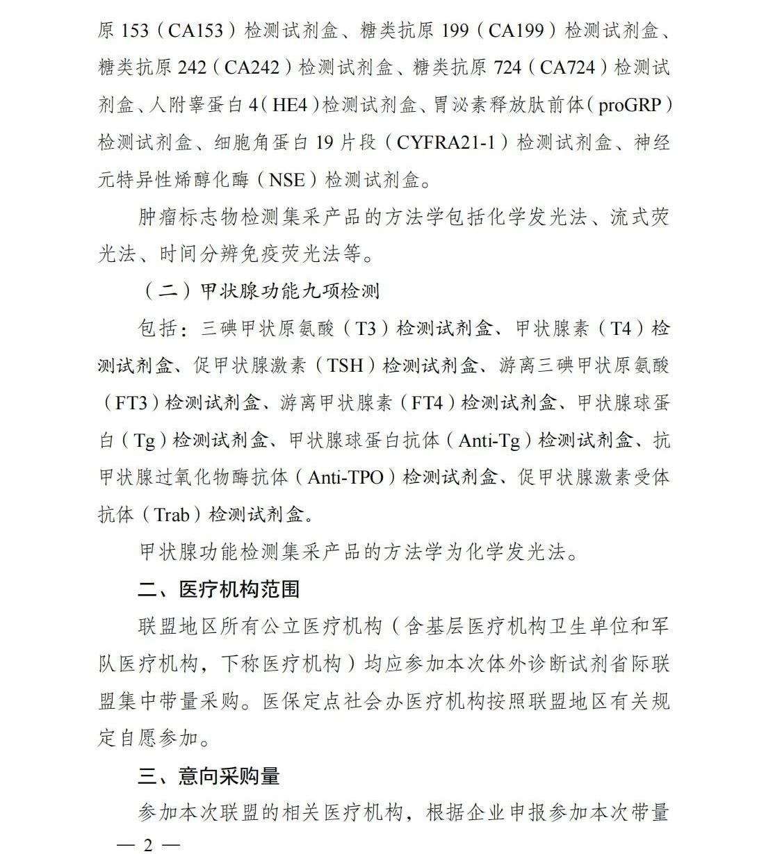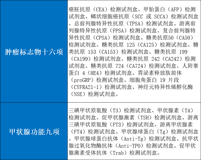 此次集采周期兩年,采購(gòu)品種包括腫瘤標(biāo)志物檢測(cè)產(chǎn)品十六項(xiàng)(化學(xué)發(fā)光法、流式熒光法、時(shí)間分辨免疫熒光法等)與甲狀腺功能檢測(cè)產(chǎn)品九項(xiàng)(化學(xué)發(fā)光法),具體如下: