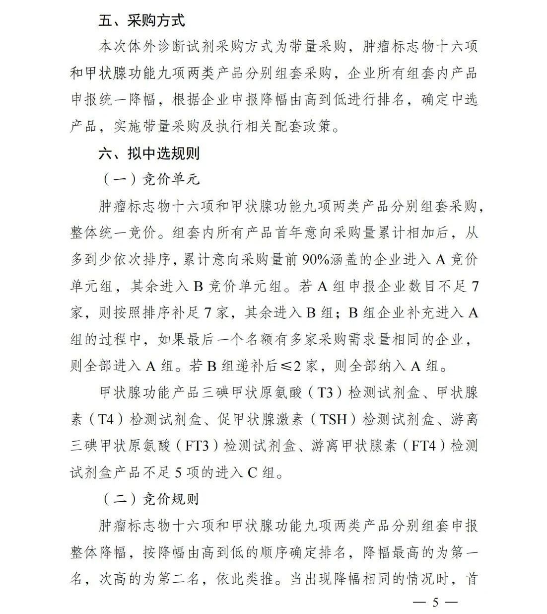 具體規(guī)則上,本次集采對(duì)兩類(lèi)產(chǎn)品開(kāi)展品分別組套采購(gòu),組套內(nèi)所有產(chǎn)品首年意向采購(gòu)量累計(jì)相加后排序,累計(jì)意向采購(gòu)量前 90%涵蓋的企業(yè)進(jìn)入A競(jìng)價(jià)單元組,其余進(jìn)入B競(jìng)價(jià)單元組,其他情況如下: