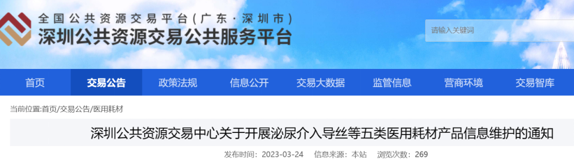 近日,深圳市公共資源交易中心發(fā)布《關(guān)于開展泌尿介入導(dǎo)絲等五類醫(yī)用耗材產(chǎn)品信息維護的通知》,開展泌尿介入導(dǎo)絲、泌尿取石網(wǎng)籃、泌尿介入鞘、泌尿介入封堵器、輸尿管成像導(dǎo)管等五類醫(yī)用耗材信息維護。
