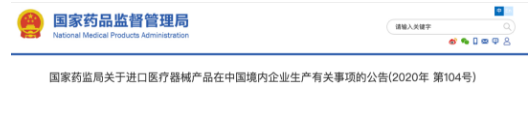 《關(guān)于進口醫(yī)療器械產(chǎn)品在中國境內(nèi)企業(yè)生產(chǎn)有關(guān)事項的公告(2020年 第104號)》