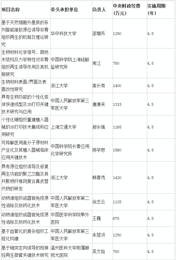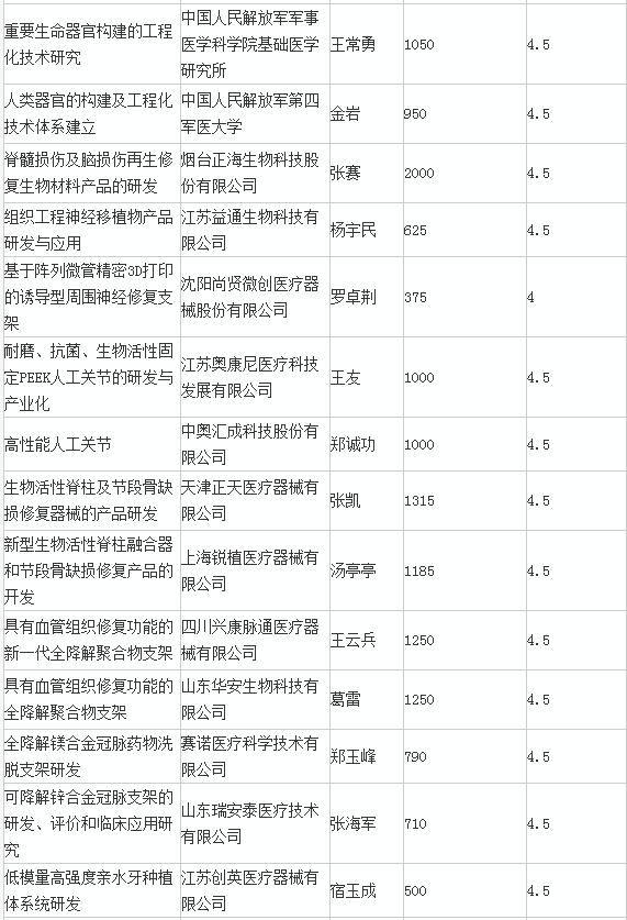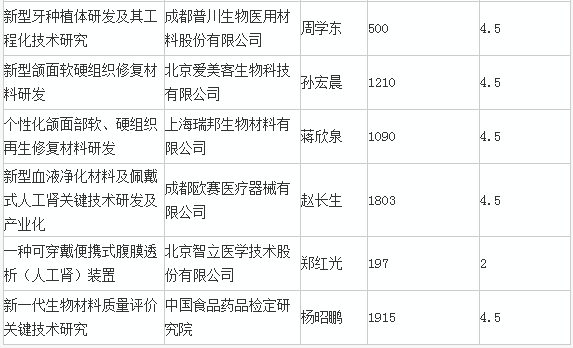 在31個(gè)“生物醫(yī)用材料研發(fā)與組織器官修復(fù)替代”項(xiàng)目中,有17個(gè)是由醫(yī)療器械公司來(lái)牽頭承擔(dān)的。