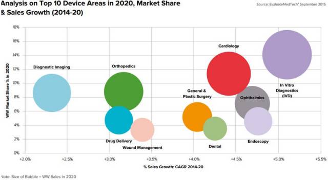 盡管一些處于初級(jí)發(fā)展階段的醫(yī)療器械公司的最終目標(biāo)仍是被大公司收購(gòu),但是保持獨(dú)立并上市開始成為市場(chǎng)的一種潮流。2015年上半年醫(yī)療器械領(lǐng)域IPO共募集資金8億美元,比2014年同期的14億美元下降41%。到2020年,全球醫(yī)療器械市場(chǎng)規(guī)模將接近5000億美元,體外診斷產(chǎn)品仍將是第一大領(lǐng)域。