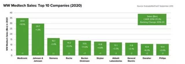 據(jù)EvaluateMedTech公司發(fā)布的《2015-2020全球醫(yī)療器械市場(chǎng)》報(bào)告預(yù)測(cè),到2020年,美敦力將會(huì)成為醫(yī)療器械一哥,將在全球醫(yī)療器械市場(chǎng)上占據(jù)7%的份額,年銷售額達(dá)到349億美元,而強(qiáng)生則只有275億美元銷售額。