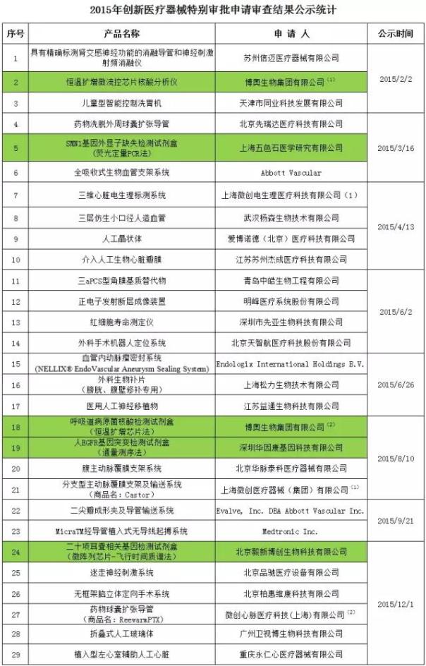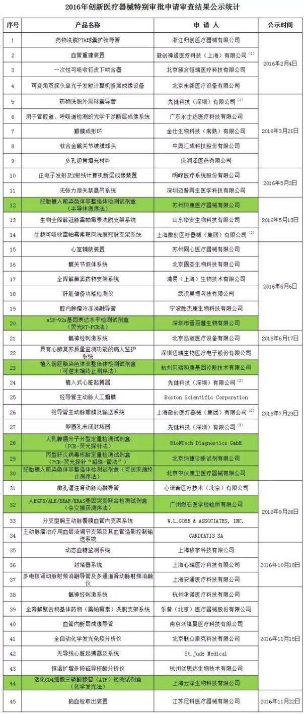 本文盤點了今年截止到2016年12月7日,通過2016年創(chuàng)新醫(yī)療器械特別審批申請審查的45款產(chǎn)品;其中有2家公司(標有上標)各有3項產(chǎn)品入圍,關(guān)于體外診斷的項目(背景為綠色)共有8項。