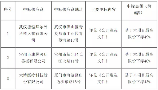 上述公告顯示,大博醫(yī)療、常州市康輝醫(yī)療、武漢德骼拜爾三家企業(yè)中標(biāo),中標(biāo)價格基于項目最高限價分別下降43%、46%和49%。
