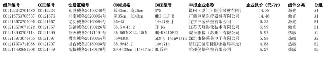 醫(yī)用膠片擬中選企業(yè)包括銳珂(廈門)醫(yī)療器材有限公司、廣西巨星醫(yī)療器械有限公司、遼寧三醫(yī)科技有限公司等,上述三家企業(yè)報價分別為14.38元、14.46元、6.25元。