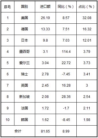 數(shù)據(jù)顯示:進口依然以美國、德國、日本三大工業(yè)制造強國為主,尤其是美國占比有三成之多。從同比增速來看,墨西哥、愛爾蘭增速迅猛,尤其是墨西哥增速翻倍達到114.4%,一躍成為了第四大進口國;此外韓國、法國、瑞士三國出現(xiàn)了負增長。