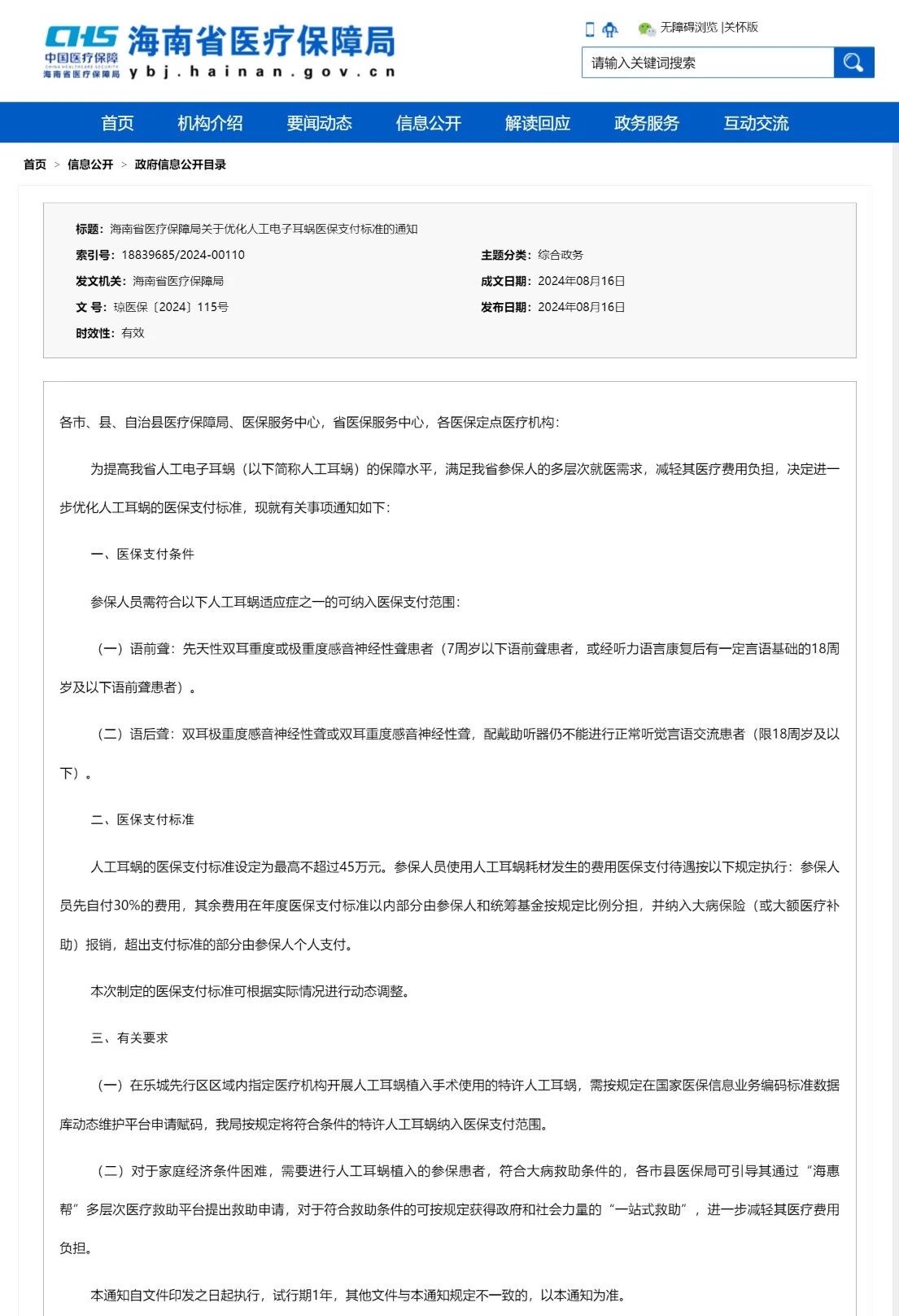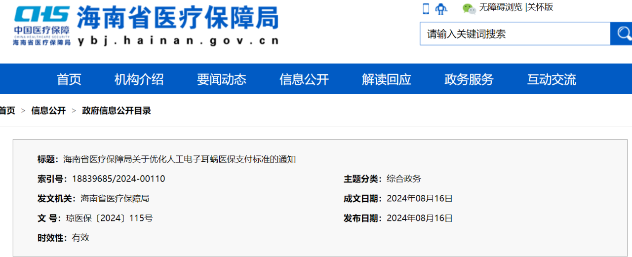 近日,海南醫(yī)保局發(fā)布《關(guān)于優(yōu)化人工電子耳蝸醫(yī)保支付標準的通知》(完整見文末),自印發(fā)之日起執(zhí)行,試行期1年。