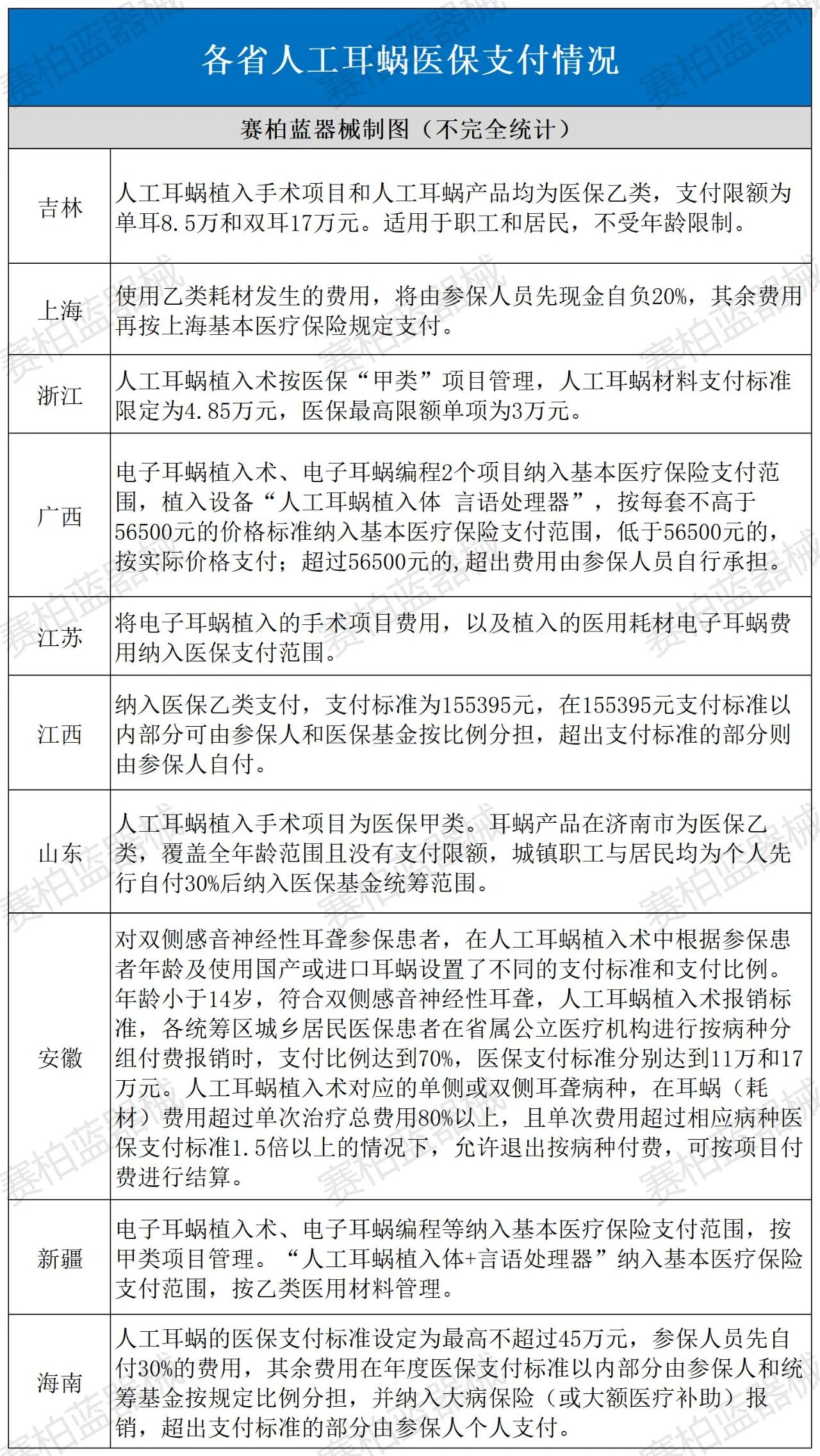 截至目前,吉林、上海、江蘇、浙江、安徽、福建、江西、山東、河南、廣東、廣西、新疆、海南等省份均已將人工耳蝸植入納入當?shù)蒯t(yī)保報銷范圍,詳情如下: