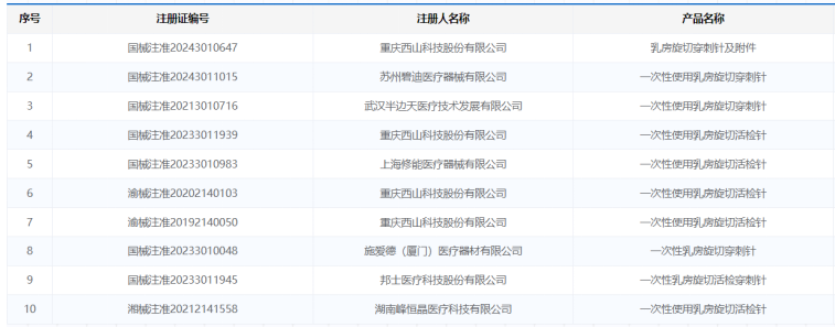 乳房旋切針相關(guān)獲批企業(yè)見(jiàn)下表: