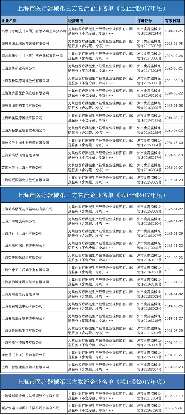 附:上海市醫(yī)療器械第三方物流企業(yè)名單(截止到2017年底)